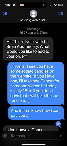 A couple of days later, I went on her website and left a message asking if I could add one more item for a friend’s birthday, and I left my number. Shortly after, I received a text from Iveliz asking what I wanted to add so she could include it with my package. She told me to order it through the website, so I did.