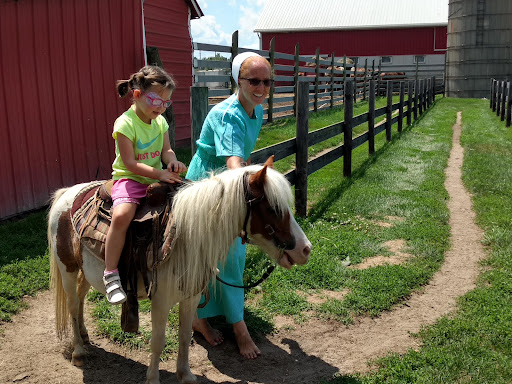 For an additional couple of dollars, your child can ride a small (up to ~60lbs) or larger pony. A worker leads the pony twice around a long fence line. It's a rather short ride, but it's inexpensive and for most young children it's plenty long enough. (They do not have helmets available.)
