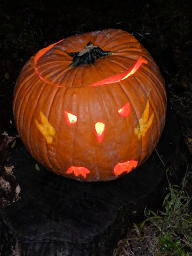 I volunteered to get out in the fresh air at Middletown's only real nature sanctuary, Bull's Run, to help remove invasive trees (honeysuckle) that have no nutritional value but that take over growing space of native plants and trees that do support the natural native environment and it's animals. Bull's Run has a number of trails inside the sanctuary. There is the main loop trail, a birding trail, butterfly 🦋 trail and a creekside trail. On 10-27-2018 Bull's Run lined the main trail with uniquely carved and well lit pumpkins for a Pumpkin...