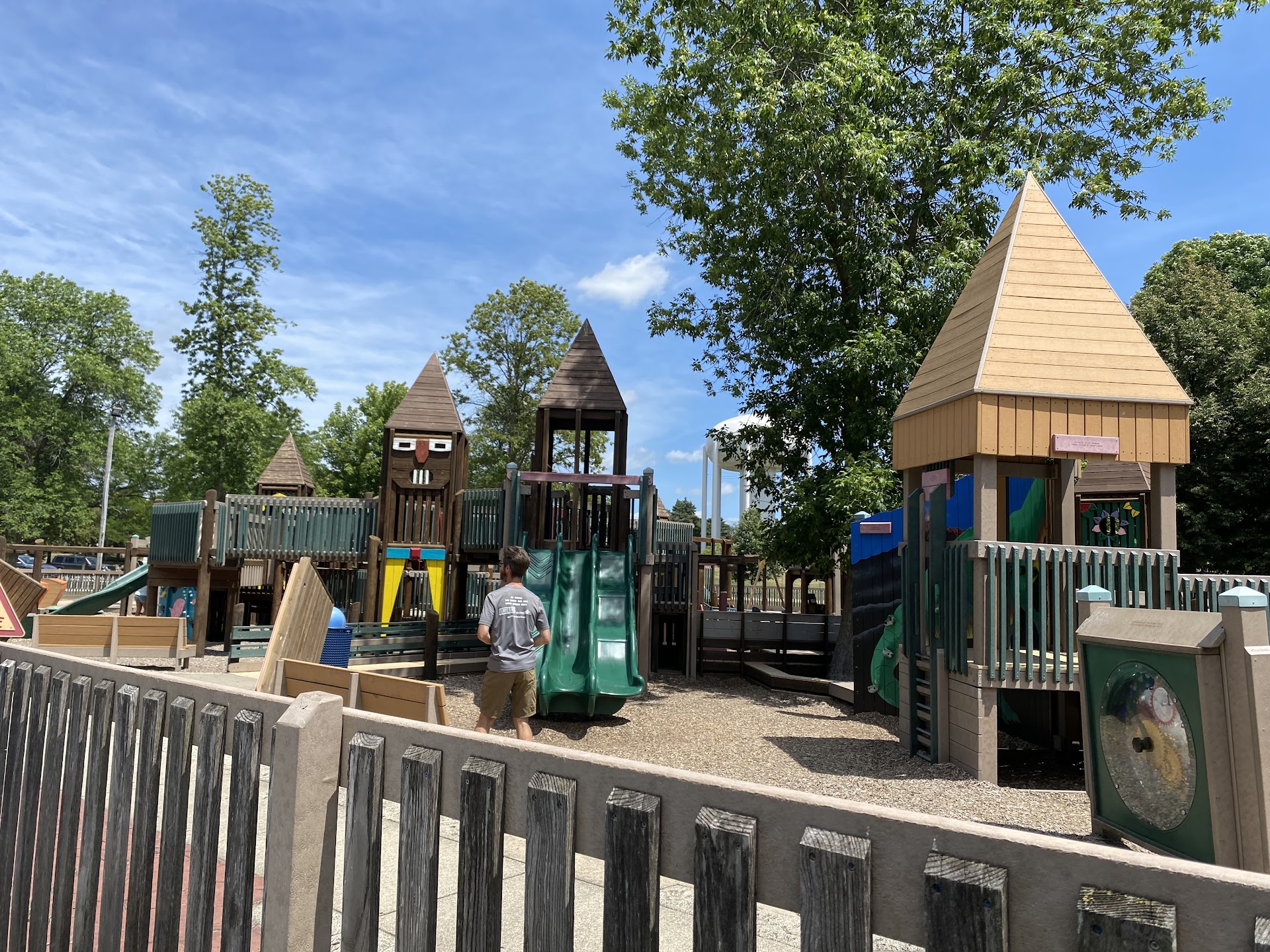 Read moreSuch a fun and unique play structure that offers numerous slides, tunnel slides, swings, a sandpit, monkey bars, a moving bridge, climbing structures, and more. The terrain is mulch, sand, some turf, and concrete. The play area is mostly fenced in with two entrances. Downside is that there is limited visibility on both entrances at the same time, so if you have a kiddo that tends to wander, make sure you watch extra closely. There is a separate area inside the play structure with one entrance that is intended for smaller children. It is easy to sit on a bench near that entrance and watch a child in the smaller area. In addition, as fun as this large play structure is, its large size and many fun play hidey holes can also make it tough to keep eyes on kids. It is also a popular city park and gets VERY busy on a beautiful weekend. There is a covered shelter close by with flush toilets. There is also a gaga ball pit. Within the same park is Plymouth Pool ($) and a volleyball pit, baseball fields, and a lot of green grass area...