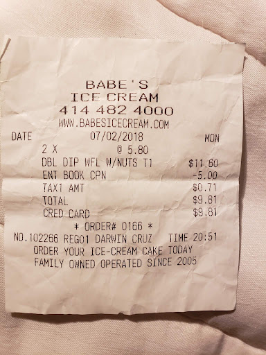 **My visit was on 7/2/18 Ice cream was good, but I'm a little confused on my total bill I purchased a 2x double scoop waffle cones dipped in chocolate with nuts Which was 5.80 X2 =11.60 I had and used a buy one get free, up to $5.00 off So $11.60 - $5.00 = $9.81??? I paid $ 9.81 when my total without any coupons was going to be $11.60 I tried contacting a manger or someone in charge and was told the owner would contact me and nothing. I called twice after a few HOURS of waiting for a call back. My concern is their equipment isn't correctly ringing out customers or worse, purposely over charging the customer. Wasn't impressed by that, especially since this was my first impression. Don't know if I'll come back. ADDED PICTURE OF RECEIPT AS PROOF