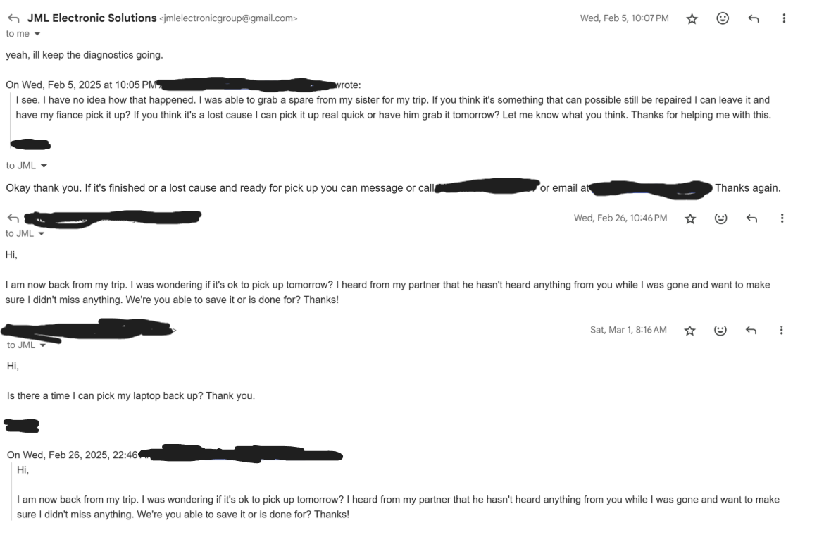 I honestly didn't want to pursue this because I really appreciate small businesses. I saw your reviews, and when I first got in contact with you on January 27th, you made me feel confident that things would be great. I was sure my laptop would be in good hands after emailing you early on. Even if it didn’t get fixed, at least I knew someone would figure out what was wrong with it. I am writing this to address your comments made to the previous review because your response was very unprofessional. Let’s get some facts right.