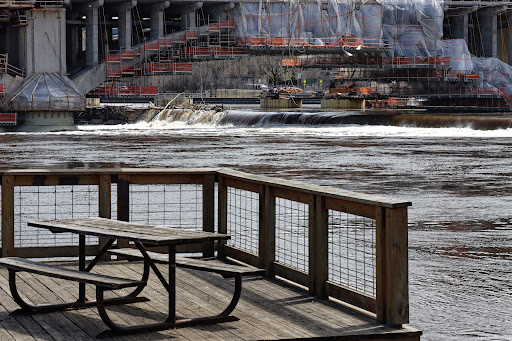 This very interesting park, encompassing a little more than half of the island, has a lot of variety in its 26 acres. The north end includes a lovely walk along the back channel from the Boom Island bridge to the rail line, and the south end includes a pavilion and amphitheater. Between the two areas is De Lasalle High School. The north end contains a small neighborhood consisting of well maintained mid-19th century homes. The island has great views of the St Anthony Dam and downtown skyline.