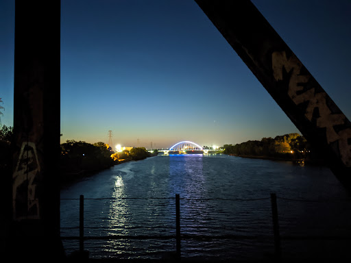 This park is decent, there's a trail that is paved and well maintained, but there's not much else to do here. The trail goes underneath a bridge and I was there alone. 2 men were standing in the shadows and they really creeped me out. Id say don't go alone, since its not the best part of town (but its definitely not the worst). It's a great place for photo opportunities though! Especially if you follow a narrow dirt bath through some trees and go onto the railroad bridge. Just make sure the park police aren't sitting in their car right by the the...