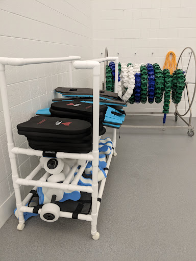 The community center has two pools, and plenty of kickboards and pullbuoys available to borrow. The masters team brings their swim bags out on deck during practice, and hangs them on hooks along the wall. Locker rooms were clean and showers were hot. Will be back next time...