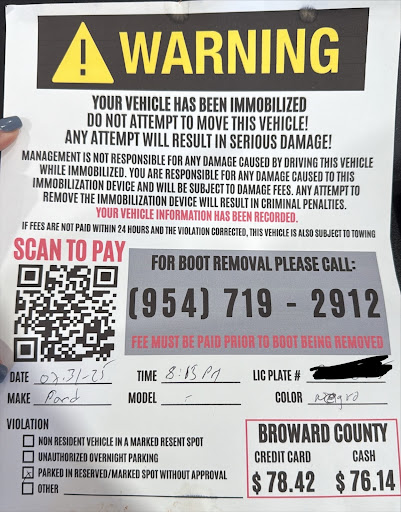 When I returned, I found a boot on my vehicle and a fee notice stuck to my window. The notice had no company name or licensing number—just a QR code to scan and pay, which felt like a scam. The on-site security company, CVS Security Group, said the boot was placed by a separate company. The security guard claimed he only had a key to remove the boot to help people leave faster but couldn’t tell me who actually booted the vehicle, only that they were “hours away.”