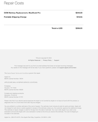 Next, I submitted a ticket to Apple. They sent a shipping box within 24 hours, and I received my laptop with a new battery 36 hours after shipping, all for $268.95 (receipt attached). Even with the original $75 charge, I saved over $150 from what Computer Guys quoted.