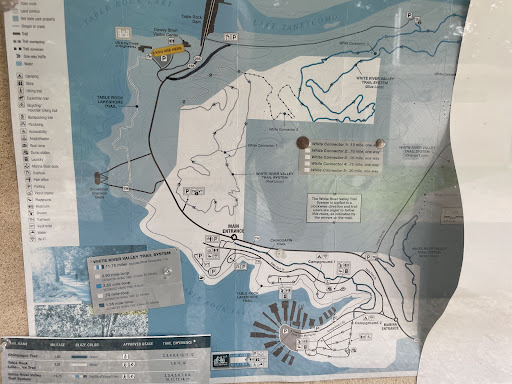 The trail is a smooth asphalt surface the majority of the trail. For the stretch by the boat ramp and the table rock day use area the path narrows to a sidewalk width and cement surface. The grades are gradual for any type of transportation, bike,...