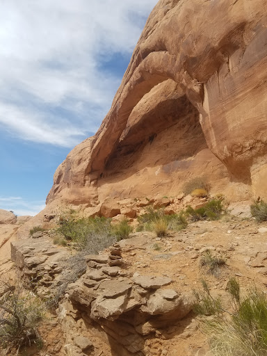 A well hidden class B natural arch secluded in the sandstone fins, just over 5 miles southwest of Moab Utah. The mouth of the short canyon that hides this arch is part of the Poison Spider Mesa jeep trail that begins on the north side of the Colorado River, approximately 5.6 miles down the Potash Road, between Arches National Park and Moab. The arch can be found near the end of the first hikeable side canyon on the right side of the road, just after climbing the road...