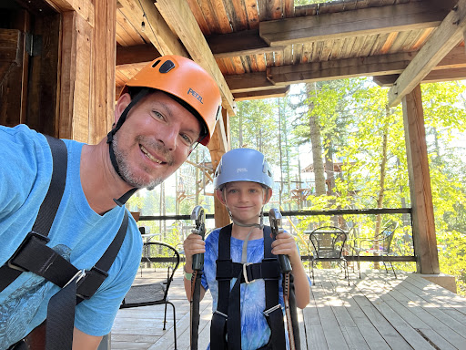 What a great time!! Perfectly priced, safe, easy, quick access! Good food and espresso too. We were tempted a few weeks back to do a smaller, more expensive ropes course near Seaside, OR but held off because we knew we were coming here and had seen it on previous trips to Glacier. SO worth the stop. You can make the course as challenging or easy as you want, and it’s quite diverse in the obstacles. The staff is delightful and helpful and they seem to just pop up whenever you need them. I went with my 8 and 10 year old and we had a blast. The staff got to (across two different obstacles) and helped my little girl faster than I could clip out of one line and into another to try and help her. She just had hard time confidently reaching at couple spot but with a little help and encouragement she rocked it. Great confidence and strength building for everyone! Again, extremely well coordinated, super safe (you literally cannot unclip yourself from the safety lines - a staff member has to do it for you), and so much fun! Kids have been playing in the swimming area that has a big inflatable raft slide for a solid hour now. Oh and you get to do all this in one of the most beautiful areas ever. Pretty much unbeatable guys! Don’t forget to call to get a reservation time and pay beforehand over the phone - saves an hour wait or more if it’s busy. Get your bum over here and get up in the air! Worth it, plus it’s really great people here. Total winner, especially if you have kiddos! (Obviously I’m sold and got the...