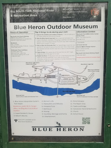 There are junior ranger questions here for Big South Fork but know that currently there is construction going on behind the concession stand area and the platform where the "school" is located is not available. Also one of the questions required the audio from one of the platforms but that particular one was not working while we were there. All the buildings are closed now and I believe will open in the summer time. There is lots of shade and picnic tables so I can imagine it would be a nice place to visit and have a picnic in the summer. There are currently 2 portable toilets in the parking lot while the rest of it is closed. There looks to be a little gift store store as well when it's opened.