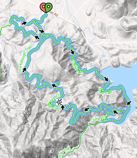 It's about a 10 mile loop if you string together both loops. I've always gone around clockwise going by the reservoir first, then making the single track climb to the top and back around to the parking lot.