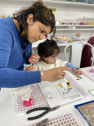 We were walk-ins and the extremely friendly staff was able to accommodate us within the hour. It worked out for us because we had an easy and relaxing afternoon planned anyway. We were warned that working with glass might lead to accidental cuts. We were worried about my toddler but she has excellent motor skills and was able to complete her 'unicorn kit' quickly and easily. My son decided to go with a superman template and used crushed glass which he guided (with some parental help) using a brush. The studio has plenty of colors, style of glass, templates and shapes to choose from.