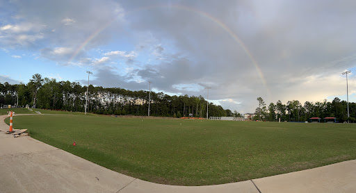 Awesome park for kids to play, adults to exercise. This park has a round cricket stadium with flood lights, and a walking path along the cricket ground, greenway as well to walk, picnic area, tennis court, kids play area, fitness court, restrooms and good parking facility with charging stations. We saw a rainbow...