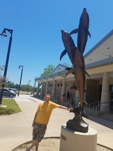 Before going inside the welcome center, I remained outside to check things out there, just in case if any rain would start. They have quite a bit of outdoor space here. There are areas to walk around, as well as areas to take your pets and allow them to do their business. One of the first things I noticed outside were all of the statues of sea life. There were several statues of fish and other water animals. Also, if you didn't notice, the welcome center has fish shapes toward the top of the building. They have lots of picnic tables to use here. Some of them are covered and some of them are uncovered. It is nice to have this variety of options. They have their regular Welcome to Sweet Home Alabama sign, as well as info on keeping their waters clean. There is a Welcome to Alabama Statue by the AL Dept. of Transportation.