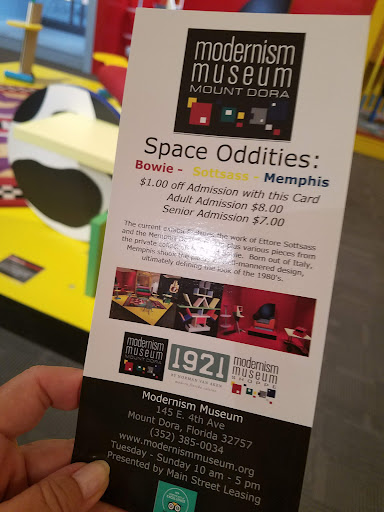 Read moreIf you ever wanted to visit an beutiful Florida town, swing by Mt. Dora Florida. And check out the Modernism Museum, it is a small Museum could take you 30min to an hour to see everything, but for price its a nice little stop. Adults are $8 and they do have discount admission for Military, kids and others just ask the desk. My wife and i went and loved it, they have a few pieces from David Bowe's personal collection. The gift shop is the reason its only 4 stars. It was nice, but not alot of items about the Museum itself it did however support local artists so thats a plus. Afterwards have a walk around town and enjoy a beutiful local...