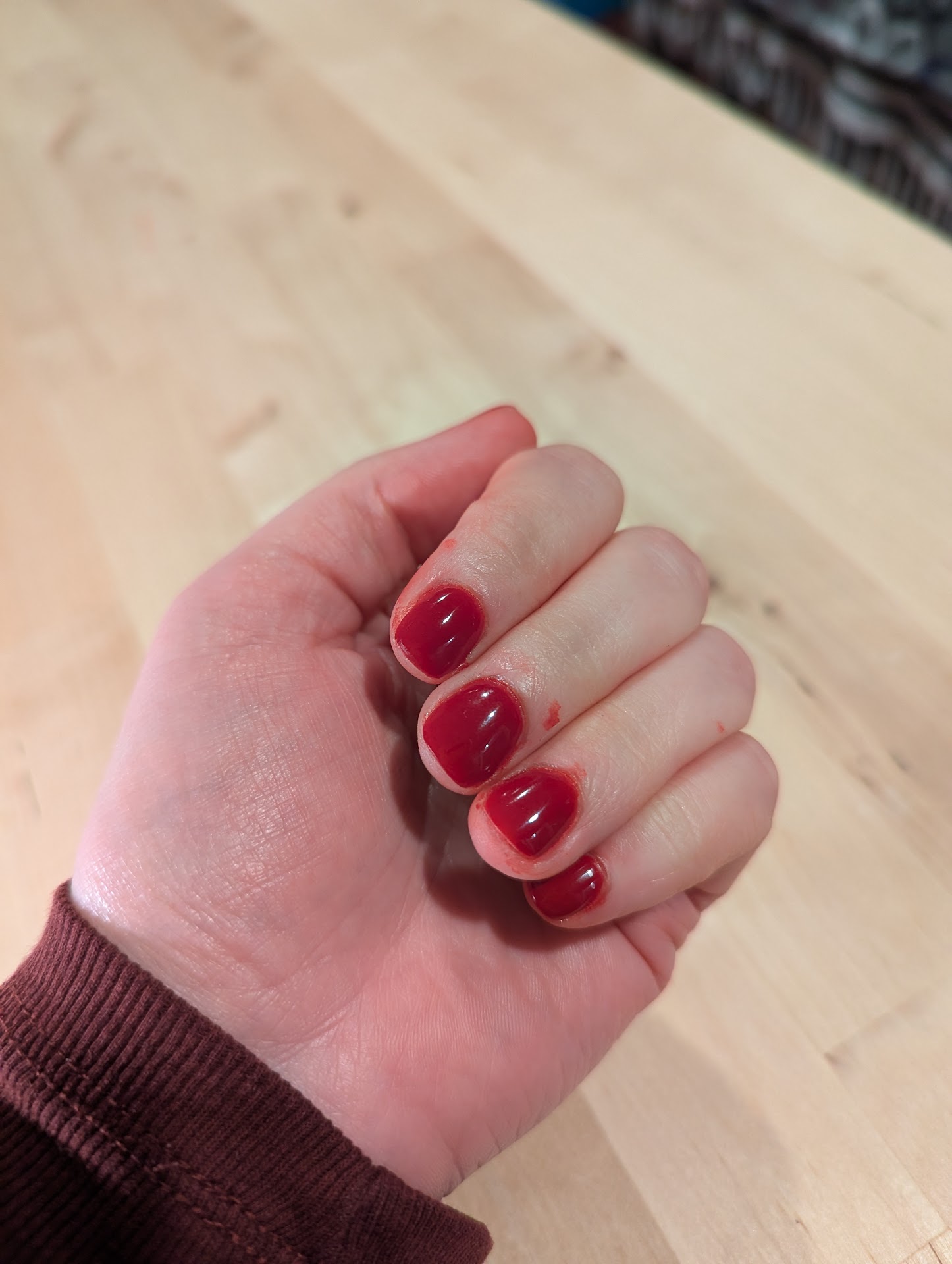 The rest of the appointment was the same - very rushed, seeming impatient and frustrated while waiting for my nails to cure, and constantly staring at the clock. I chose to not do extensions this time since my natural nails had grown in, but she did not do anything to shape them so they ended up being different lengths and shapes. I had to shape them myself when I got home to even them out. She also left powder all over my fingers, which took days to wash off because it was so stuck on there from the UV light, and irritated my skin throughout the rest of the week. Tara noticed this at the time and laughed it off telling me to just wash my hands. For comparison, I got my nails done somewhere else 2 weeks later with a similar bright red color, and there was absolutely no residue left on my skin or around my nail.