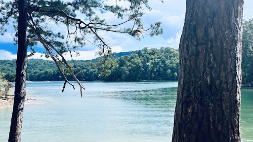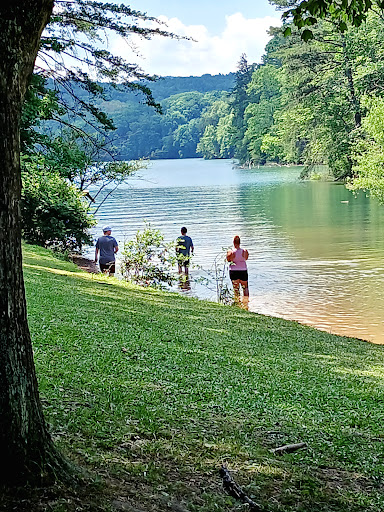 Lake bottom is all red Georgia clay here. No good fishing because there were 4 or 5 other groups of people with splashing kids. Water was quite warm. Fine for swimming. Good area for smaller kids as long as supervised because of the sticky bottom. At least one large grill and 5ish picnic tables, plus a few benches. Clean, short grass good to sit on or lay on with a towel. Plenty of shade areas. Big beautiful trees. Lovely lake view and mountains in...