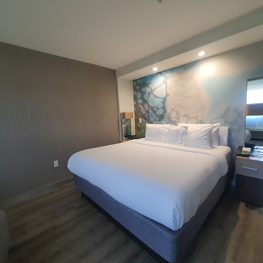 Read moreIt's a Marriott, so a nice hotel. Pretty sure they said they are an ''eco'' hotel on check in, whatever that means. OK - great. ||Got to room - freezing!! Guess was prepared during warm part of day and aircon left on (not very eco!!!). Arrived at night.. felt SO cold! Set to heat and after some time, felt better. ||Never mind re-using towels, the problem is usually just that there is nowhere to dry them, if more than one person in the room. This was a 2 person stay. This was ok... space for 2 larger towels on the single rail, IF both folded in half. Hand towel soaked from washing long hair, over shower curtain rail... but hotels please, if you want us to re-use, provide adequate drying space for how many people can use the room!! ||NO service - guess part of ''eco'' too. So room never tidied, trash never taken. There is coffee left for one day, so you have to ask for next day and next day etc. OK, can ask of course, just wish they'd at least replenish this as standard for each day of your stay - they make the guest run around... all for $200 a night ;) No water or anything in the fridge - again - you can ask = buy. ||Shame that rate doesn't include replenished water and coffee, and also breakfast. You can order and pay for breakfast at onsite mini Starbucks (no thanks) or get an actual breakfast at Denny's, just down the road ;) ||Wifi worked throughout so that is real helpful and appreciated. ||Lobby space was nice - seating by the Starbucks and booths and and other spaces around the other side too. ||Only saw outdoor pool/jacuzzi - nothing indoors?||Room was nicely done - This was a 2 queen bed room. ||Rooms seemed pretty soundproof - you'd hear people in the corridor at times, but were not aware of sound from adjacent rooms, so that was great.||Bathroom provided shower gel, shampoo and conditioner. No moisturizer. Tissues - but again you'd need to ask if ran out. Hairdryer provided also. ||Lamp in corner over comfy chair, wasn't working. ||No safe. ||Several hangers, 2 large drawers, 2 small drawers. ||Fridge, coffee machine. ||Lots of sockets and USB points. ||Some lighting was dimmable which was nice. ||Check out smooth, although didn't bother to ask how the stay was or thank us for staying... and there are a lot of other hotel options available. ||So it was good, but some improvements would be make it great, and would be expected to be found really, for the...