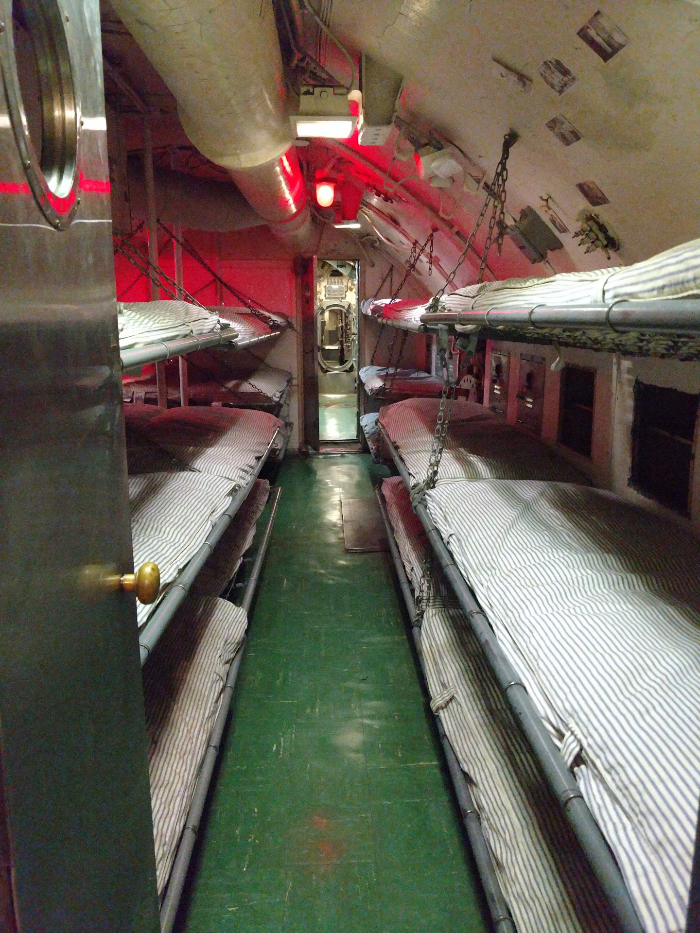 You walk the plank to her decks, to see the equipment needed to live a life at sea and win a war. Walk forward to the forwarded hatch, and down ladder to the forward torpedo room. See the shining brass torpedo tube doors. The torpedoes in racks, the reloading gear, and the bunks right there next to a giant bomb.