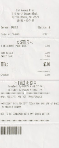 Read moreThe pier as a pier to view the ocean, to shop, to hang out it was very nice. The price for all-day fishing there with rod rental and one tray of bait was only 27.50 that is a sweet low price that is much lower than most piers that I have seen. I did not fish there but that price has me planning on coming back. Elevators are a big plus total access for people with disabilities. They also had people driving carts to pick you up from parking lot. We did not try the restaurant on this visit. Having looked at the menu there is a huge variety of choices for any appetite, just about anything you could be in the mood to eat is there. They charged us 2.00 to hang out on the pier all day until midnight. That is good also if you want to come back with no extra charge. There is access to the beach right beside the pier so as a place for someone not staying in a hotel facing the ocean, this place is wonderful, with them serving breakfast, lunch and dinner and with a shop to buy so many things you'd need for the beach, this is a place well worth...