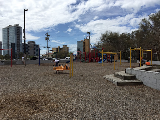 This newly remodled park is neat and the equipment for older kids looks fun. My 1.5 year old loved the smallest play equipment for 2-5 years. The slides are small enough that he enjoyed them, and I liked that I didn't have to worry about him falling as much. The one negative thing I would have to say is that, as mentioned in other reviews, there are groups of (what I believe to be) homeless men that sit in the area next to the playground. One man actually approached us and offered us candy. This seemed totally innocuous and he was friendly enough. I don't want to be "that parent", but you just never know. Just be prepared if you take your children here. Pretty cool park and I like that it isn't right next...