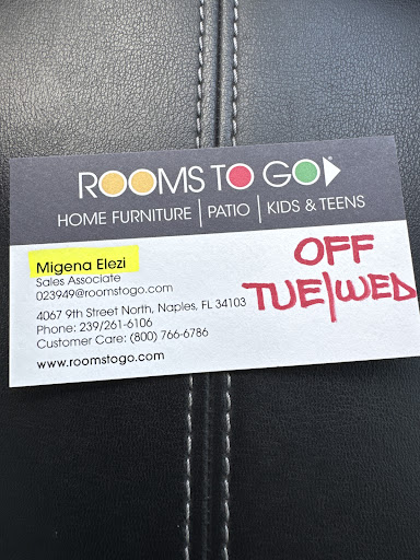 Read moreI had a fantastic experience shopping at Rooms To Go in Naples, FL, all thanks to Migena! From the moment I walked in, she greeted me with a warm, positive attitude that instantly made me feel welcome and at ease.
