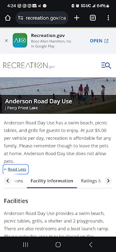 Ā Ā Ā Read moreWe went there Sunday to have my son's 6th birthday party we got there at 7 a.m. and set everything up my wife got there at 9:30 with the food and cake she had to leave to go pick up one of our guest and I told her it was okay at the gate but when she got back they would not let her return into the recreation area because it was full they said but there was several Open Spaces to park I would suggest if you go here you make sure you have everything you need because if you leave they will not let you back in with the same ticket that you purchased that day they let everyone in who hasn't paid so they can get more money and tell everyone that has paid they have to get back in line and wait they would not even let her get in line they turned her away and several other guests that came to the party not a good experience I would not recommend this for anyone they're only out to get money out of people they tell you your spot is paid for but then they give someone else your spot and take their money also for it and if you're thinking that you can save a spot for someone you can forget that they will not allow you to save a spot even though you paid $5 for that spot very unhappy about the situation ended up packing everything up and going home and having a party just so you know it's not a good place and not very friendly either their exact words were we don't care you're not supposed to have birthday parties here anyway since when do they have the right to tell you where you going to have a birthday party for your kid very unhappy we will not be returning to their place again Anderson Road...