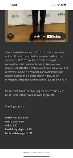 Ā Ā Ā Read moreI learned about Breon Hair Salon through my boss when I first moved to Nashville almost 8 years ago. My boss had been a faithful customer since he had moved to town a few years before that and always had great things to say about Breon and her staff, so I thought I'd give them a try. I have not let any other salon touch my hair since the day I walked through their door almost 8 years ago. Breon and her team have taken care of my hair, colored it many different colors, cut and styled it many different ways, and their customer service has never faltered.