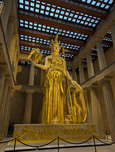 Really amazing place. It's smack dab in the middle of centennial Park, which itself is really beautiful. So many people enjoying it. As you walk around the Parthenon, it's really crazy to think how this is a exact replica of the real one. It's really beautiful on all sides. There is an entrance on the bottom area not facing parking lot. It was hard for us to find the entrance. It was $15 a piece for us to go inside. There is a museum to check out with the information on the Parthenon and how this one here in Nashville came about. We also had an art gallery within the museum. When you go upstairs and you are met with this huge replica of the goddess Athena. Absolutely beautiful and it's huge off to another room. There are also replicas of more statues within the Parthenon that were casted for the Parthenon in Nashville, if you're in the area, I would definitely suggest you stop by. Even if you're not able to go in during the museum hours, the outside is still really great in the park is...