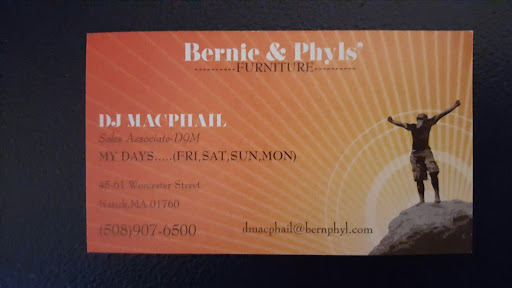 Read moreYou know how they day that the 3rd time is the charm? It was. we were out lust looking for a reclining love seat for future purchase, not necessarily to buy yet. first two places didn't have any to view- I realize space is a problem but sometimes you just have to SEE and try the item. At the first place we were told that the dimensions for the love seat would be listed on the back of the sofa on the floor and we could then imagine what it would look like. At the second we got no help at al, not even eye contact from the one person in the area on the phone with another customer (from the conversation, it was NOT a personal one, but I worked in Retail long enough to know that you should at least acknowledge the customer). So, when we walked into Bernie & Phyl's and were immediately greeted and directed it was already a step above what we'd already experienced. The living room section was upstairs and, at first, we couldn't find any help (this was around noon on Sunday so person could have been on break or helping someone else) but did find a display of all three pieces offered in a particular model so we went looking and found someone in another section who quickly offered to help. We had easy questions which Michelle was able to answer and decided to purchase on the spot. She LISTENED to our questions and concerns and what she couldn't answer herself found out right away. So, in 3 to 5 weeks we'll have a new loveseat which will suit us. We are retired, love movies and comfort was the prime concern, as well as color. This one only comes in one color but it would fit in with the rest of our furniture.. Thank you, Michelle. No high pressure, just like buying from a friend who was concerned with our comfort in...