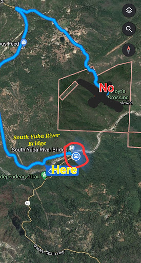 Read moreMap is not correct, cannot enter private land. See screenshot, go to South Yuba River Bridge and park. Cross the bridge and take high trail to actual Hoyt's Crossing. 15-20 minute walk depends on pace. Careful of narrow spots with long steep drops, NOT a child friendly path! Leads to a nude area of Hoyt's Crossing, both men & women enjoy sun bathing by the river. Simply beautiful ancient river bed with a fast, cold, crystal clear water flow. Enjoy, watch your step in and out. Wear shoes, it is a moderate hike. Google has since added the correct map, make sure it's the same as shown; South Yuba River Bridge...