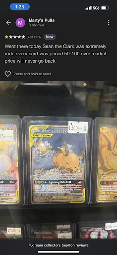 Have worked with 3 owners Phil, Shawn, and Will and I am a big fan of all 3 of them. I have been coming in every Tuesday for the last 2 months and not once did they not work with me on price to work out a sale, very rarely have I paid sticker in their shop. As far as selection goes, they have the best anywhere near me by far so much variety of vintage and semi-modern product. as far as these negative reviews go, last Tuesday I bought a raw pokemon center Charmander from the Obsidian Flames ETB for 110 dollars (Their Sticker Price) the card on the day had rapidly jumped to 150 raw, do you think they asked me to pay 150 NO! they honored their sticker price and adjusted the remainder of their raw Charmander's accordingly on their next business day. I make deals on FB marketplace, and I buy from 1st Edition Collectibles that's it. What Guarantees my continued business, on my last visit to the store I asked Will if he had any 151 poster collections, they did not, and I said "dang my GF really wants that poster lol" he handed me an extra one they had in back and said have a nice day. Kindness goes a long way in this Industry and its a two-way street; the fact they are willing to even Barder is a privilege almost no LCG would ever provide. Thanks For being kind I got you guys on the...