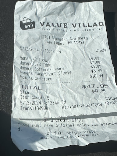 Read moreHORRIBLE customer experience today. I went into Arc’s Value to find clothes for my great-grandmother’s funeral. My experience was great until it came time for checkout. According to the receipt, Cindy was our cashier on 5/13/2024 at 4:13pm. Cindy didn’t greet me and my party, she didn’t even motion us to move forward in the line to checkout with her. Cindy then proceeded to ask us to “hold the tag out” for each item when I had already laid the items out on the counter for her. I was confused because I swear I wasn’t the one clocked into a shift, right? Cindy then proceeded to tell me to remove the hangers from my own clothing and told me, “The hangers go in that bucket by the window.” Again, I don’t recall clicking into a shift at Arc’s Value Village today. I’ve never been instructed to do these tasks with other cashiers at this location before. I would be TOTALLY understanding had Cindy provided great customer service from the get-go, but she didn’t. After leaving the checkout, Cindy didn’t even greet us on our way out. This was a joke of a customer service experience. I would’ve much preferred a self checkout lane since Cindy made us do 50% of her job as a cashier.