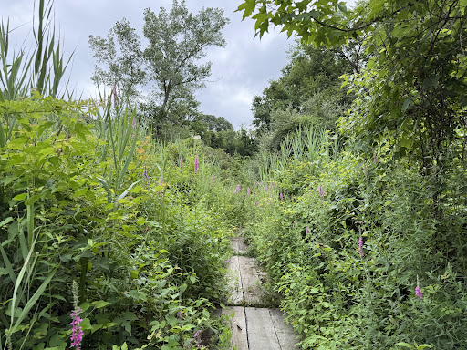 Beautiful trail but partially overgrown in mid-July, winding through tall grass with bushes almost closing on it. Ticks would be very real concern. I made a loop starting from Alley Pond environmental center.