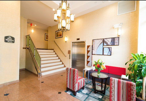 The hotel is in a rather sketchy part of town, and it's not an area I would feel comfortable letting my girlfriend walk around alone at night; however, during the day, it's fine. The nostrand A train is right across the street, and the nostrand C train is just a couple blocks away. It's about a 25-35 minute train ride into Manhattan (Times Square/Central Park.)