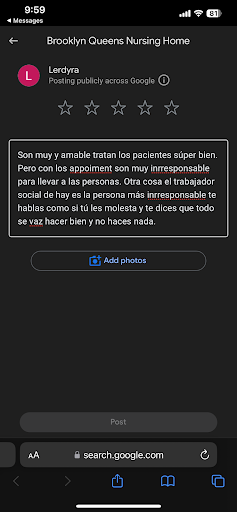 Read moreI was admitted to the Brooklyn Queens Nursing home for recuperation in 2022 after being in a coma for three weeks at Lincoln Hospital in the Bronx. I was transferred to the Brooklyn Queens Nursing Home for physical therapy and while there I experienced considerable trauma.