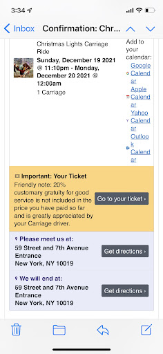 Read moreMy wife and I booked a Christmas light tour for Christmas Eve. We were expecting an enchanting evening full of beautiful holiday decorations, and our driver Ugur and his beautiful horse Angelina did not disappoint!!! Ugur was very friendly, pointed out all of the popular areas in Central Park and nearby that any visitor would like to hear about - he also has a great sense of humor and kept us entertained. Angelina led us through busy, light clad streets with ease and comfort. We had a nice clean warm blanket to cozy up with, and Ugur offered to take our photo in front of the beautiful scene at Rockefeller. It was also obvious that he really cared for his horse, Angelina, and allowed us to feed her some goodies after our trip. We couldn’t have asked for a more magical experience, and are grateful that we chose Eco Central Park Tours to show us all that the city has to offer in the way of magic and whimsy. Thank you, Ugur and...