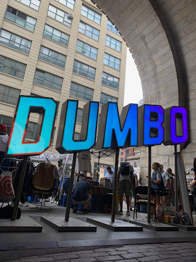 The Dumbo Sign is designed by Dumbo-based multimedia artist David Crumley. Originally set up in front of the bridge - it was designed to change colours based on the reflections of its surroundings. Crumley stated "“I designed the DUMBO Reflector to literally reflect the culture of DUMBO back...