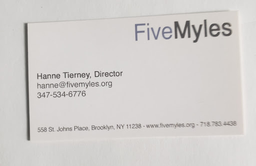 FiveMyles gallery is located in the Crown Heights area of Brooklyn. Founded in 1999, it is a non-profit gallery that exhibits visual and performance art. Its founder/director is Hanne Tierney. FiveMyles was the location for the Crown Heights Film Festival in 2017, 2018, 2019 and 2021.