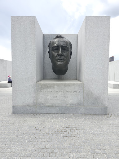 Eleanor Roosevelt is the wife of Franklin Delano Roosevelt, FDR. We should remember her work and equally pay tribute. Her visits to the UK influenced the USA into The European Wars. Here, we see the larger than life size statue of FDR's head. If a statue could speak to you, this one would, be some version of the 1932 origins, which led to the famous, "The Four Freedoms" Speech. Let's read the polished 1941 transcription now: "First, is the FREEDOM OF SPEECH AND EXPRESSION, everywhere in the world. The Second, is the FREEDOM OF every person to WORSHIP G-d, in his own way, everywhere in the world. The Third, is FREEDOM FROM WANT, which, translated into world terms, means economic understandings, which will secure to every nation, a healthy peacetime life for its inhabitants, everywhere in the world. The Fourth, is FREEDOM FROM FEAR, which translated into world terms, means, a worldwide reduction of armaments, to such a point, and in such a thorough fashion, that no nation, will be in a position, to commit an act of physical aggression, against any neighbor, anywhere in the world. This nation has placed its destiny, in the hand, and heads, and hearts, of its millions of free men and women, and its faith in freedom, under the guidance of G-d. Freedom means the supremacy of human rights, everywhere. All our support goes to those who struggle to gain those rights, and keep them. Our Strength is our unity, of purpose to that high concept, there can be no end....