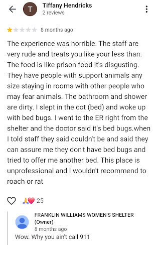 Ā Ā Ā Read moreI was there for a very short time. During that time I had the worst experience ever. I have a service dog and an emotional support dog. I had everything that was needed as far as paperwork goes. Angela told me I had to take my babies to a drop off shelter, after I met ALL requirements. She is very clearly afraid of dogs and treats any dog owner with nothing but disrespect. From the first day meeting her she, Angela was nothing short of unprofessional and disrespectful. I went there due to a domestic violence situation. I was told to go to her to get an appointment. She told me she did not have time to deal with that. On the 29th I tested positive for covid. Even though it was known that I was there for a DV situation I was locked in a room by the medical staff. The staff packed my belongings, under the direction of Angela, they cut my lock even though I had the keys for my lock. My sim card and phone was stolen out of my locker by the staff. Once my things were packed and the driving service was called, Angela left her post as if her work day was over. She came outside and was being very loud and unprofessional telling me to hurry up get my stuff and leave. I wrote another review on someone elseās phone because mine was stolen, not by a resident but the staff. This one is being done on my laptop. The owner responded with They were sorry this happened to me. While I appreciate the comment. Something must be done with Angela, her behavior as a professional is completely unacceptable , also I need to be compensated for my property that the staff there either...