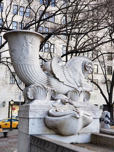 On the south end of the plaza is the ornamental Pulitizer Fountain. More flowerbeds lead up to the fountain, while a row of trees create a buffer between the fountain and 58th Street. More benches and fountain rim seats found here as well.