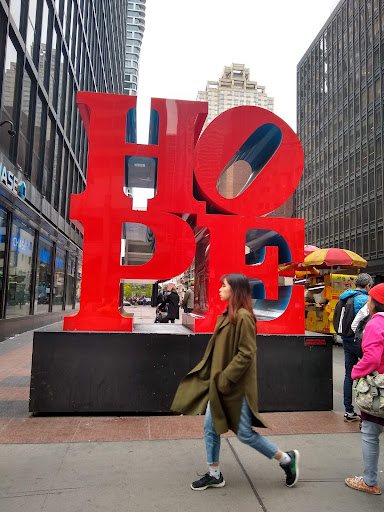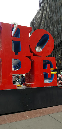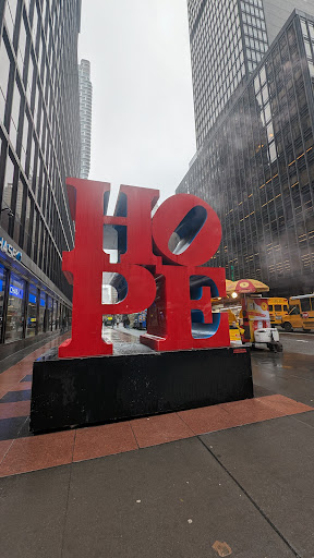 Hope Sculpture: I found it constrained and hollow. It is red and the HO is on top of the PE. I walked around it, just for appreciation. I looked for the sculptor's name or a thought about it. I just found the name of INDIANA engraved and nothingness on thoughtful. I knocked on it. It is hollow and the material seems like aluminum- I am not sure of it- There are always people taking pictures or selfies. The surroundings are not too clean. Anyone can see a potato bag or a plastic bottle around. However, the sidewalk of HOPE around it, is hoping to be cleaned by the City? It shows signs of old black steps prints on and on and over and over. If you go pretty near, you will feel a sense of abandonment; Something like an empty stadium after a game. Then I walked to the back of HOPE, and read OH... on top of EP...And I asked myself, what is exactly the meaning of this HO/PE? It's located in an amazing corner of 53rd /7th Ave. Manhattan . Next to it ,the Chase Bank; Crossing 53rd street, there is an amazing public plaza with tables and chairs. Good sitting! Looking from the plaza ,transversally, in front of HOPE just crossing 7th Avenue, there is the Sheraton Hotel. Beautiful, Elegant. Breathing an air of international flair with flags. Feels very comfortable ,manicured and clean just looking at it. The Entrance, though in a traffic area, is very ample and inviting. The first day that I saw the hotel brought me memories of my private high school. The premises were bought by Sheraton Hotels and today, there is an almost replica hotel of this one in what used to be my school grounds. The ambience in the area is amazing and needless to say inviting. The smell of the air, the lights of the street and theaters plays give a sense of high and wellbeing. And, still that corner is not so full of people which is an advantage as opposed to one Block down on Broadway. Well, I went down to get something fast to eat as I was working. In the corner of HOPE, there is a Hallal food Street Vendor with the smallest line of the ones around. Then I made the line. They told me a regular plate was $9.00 and I answered that was overpriced because at Times Square was $7.00. Then he showed me a diminutive plate. I agreed to take that one. I still was not happy because they were substituting the expected tomatoes with bread; the salad was warmed iceberg lettuce; I had to check if they put rice- no joke- because it was not visible with the lettuce, and the chicken was scarce. They were joking because I counted the $7.00 twice before I handed them to the vendor. My surprise came when I was upstairs and I realized they didn't put utensils nor napkins in the bag. How did they think I was going to eat? After explaining two or three times what has happened, a person brought me two plastic spoons and one knife and told me that this was one time only. I thanked the person. Now going back to HOPE , I noticed that HOPE has many visitors with and without cameras; I am not familiar with the local believes and frankly, I found the sculpture too commercial, hollow and empty; However, maybe, just maybe, there is a solid reason for HOPE being red,stands out in the corner, and is standing as high as possibly it could be... like... catch me,... if you can. To be fair, food was not bad, but scarce. The service... um...um..um... However, the area atmosphere feels right and kind...