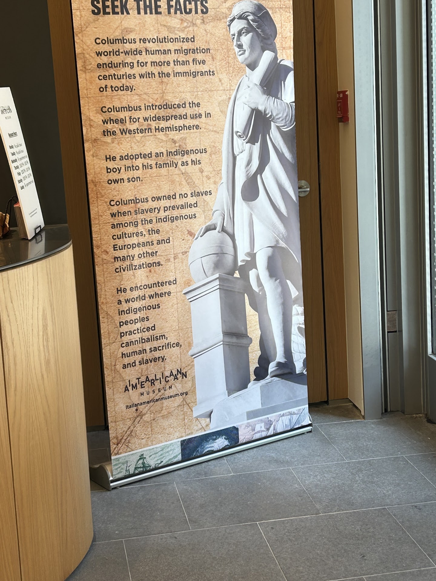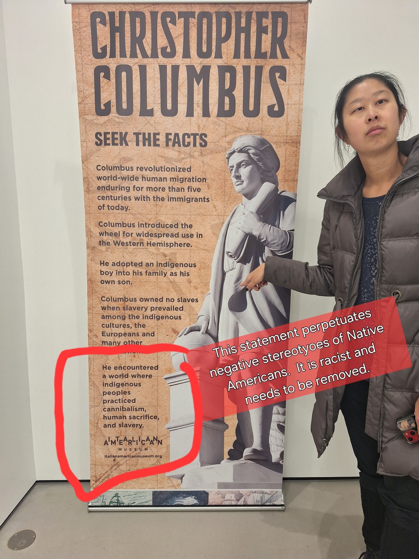 I was initially excited to visit the newly opened Italian American Museum in Little Italy but was immediately shocked by this display about Christopher Columbus. It says that he "...encountered a world where Indigenous people practiced cannibalism, human sacrifice and slavery." Is this even true? Does this statement reflect positive contributions that Italians have made to New York City?