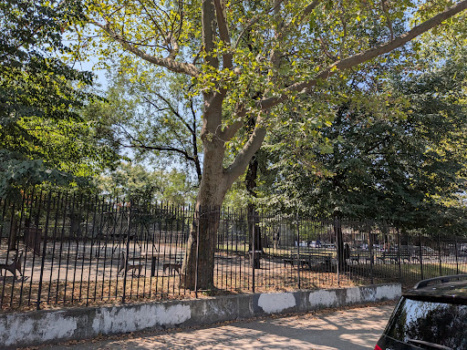 It's cute here!... The playground has an NYC subway theme. There are swings, some shade and patches of grass, chess tables, basketball courts, and handball courts. There's also some great metalwork in the fence surrounding the playground.