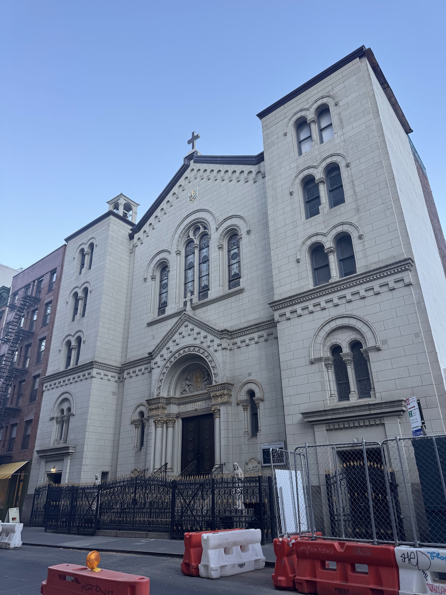 Most Precious Blood Church is located on Baxter Street in Little Italy, NYC. There are about 10 steps leading into the church.