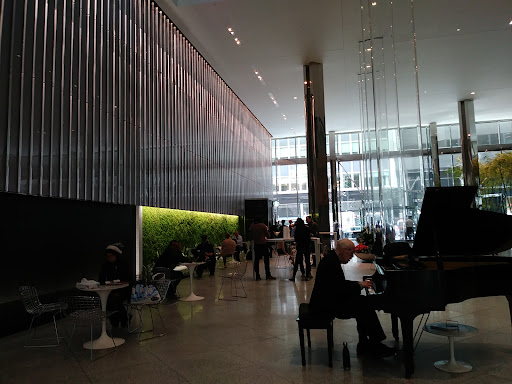 We attended a job-fair related meeting in the building's public space located in the lobby atrium. This atrium is very modern, imposing, and impressive. It is extremely clean, neat, and HUGE. The reception desk is up the escalators on the 2nd floor (1st floor for you Anglophiles!). We were there around Noon-ish on a Saturday and it was pretty sparsely populated except for the large area equipped with tables and chairs where many people were having lunch or just hanging out. I don't like to judge by appearances, but in addition to some obvious blue-collar guys having lunch, the remaining crowd were street-people, taking advantage of the warm environment. Every table was occupied and every chair taken, except for one or two at otherwise full tables. This would be a nice place to rest your feet or grab a sandwich but for these apparent indigents bogarting the seating. I'm not begrudging anyone anything, just sayin'. Maybe management keeps the space turning over regularly during working hours, but I was there on the weekend. Like I said, I wasn't up inside the office floors, but if they're as well-kept as the atrium, this is a...