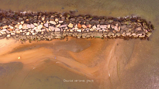 This is in Orchard Beach. We were walking the boardwalk and stopped by the end to look at the water and this day a couple was walking over the rocks and we were standing up watching them and the water and what's across the water on the other side. It's a great place too to let your dog run...