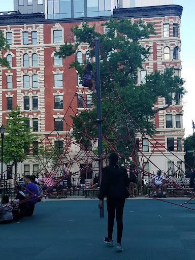 Great playground!!! A lot of different activities for ages 0-18 + (basketball ring) playground decided into sections for kids 0+ age with tiny slide, soft ground, sensory activities, 2+ age with bigger slides, balance wood planks, climbing wall, spins, 5+ age with climbing boulders, running maze with plenty exits and slides, spins, bars, all ages section with web, cool slide, spins and big open space. Has plenty benches, tables to play chess, tables for lunch time. CLEAN, NICE VIBE, HAS RESTROOMS. 1 star is out BECAUSE Restroom building is right IN THE MIDDLE OF ALL OF IT. And it blocks the view. You literally have to run after your offspring if you can't contain them in one area. OR you risk getting a heart attack losing your child out of the view AND ALSO because of the fact, that people TEND TO LEAVE the gate OPEN, when there is 123rd street, with cars driving,...